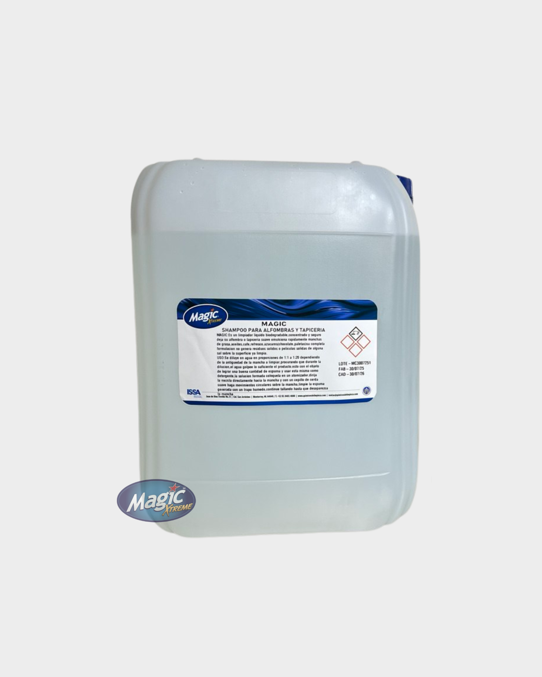 Magic es un limpiador líquido concentrado, biodegradable y de acción espumosa, especialmente diseñado para la limpieza profunda de alfombras, tapicerías y superficies textiles. Su fórmula avanzada garantiza la eliminación eficaz de manchas y suciedades difíciles, dejando las fibras suaves, con aspecto renovado y un aroma fresco y agradable.
