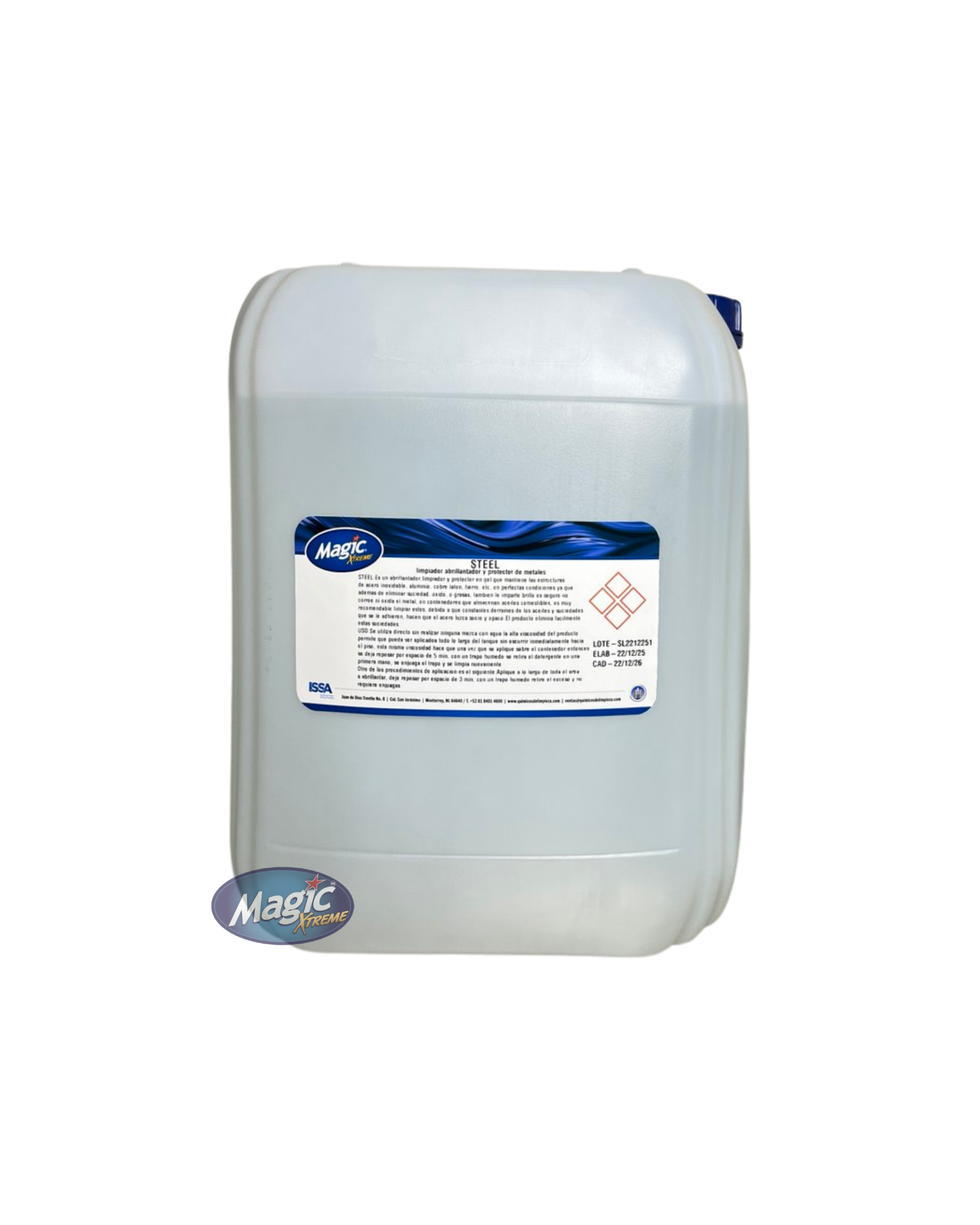 STEEL es un producto en gel que limpia, abrillanta y protege superficies metálicas como acero inoxidable, aluminio, cobre, latón y fierro. Su fórmula elimina suciedad, óxido ligero y grasas, dejando un acabado brillante y uniforme. Su alta viscosidad evita escurrimientos, permitiendo una aplicación uniforme incluso en superficies verticales o tanques de gran tamaño. Es seguro al contacto con la piel, no corroe ni oxida el metal, lo que lo convierte en un producto confiable para múltiples aplicaciones. En contenedores de aceites comestibles, resulta ideal para remover los residuos de derrames y grasas adheridas que opacan el acero, devolviendo su brillo natural sin riesgo de contaminación.