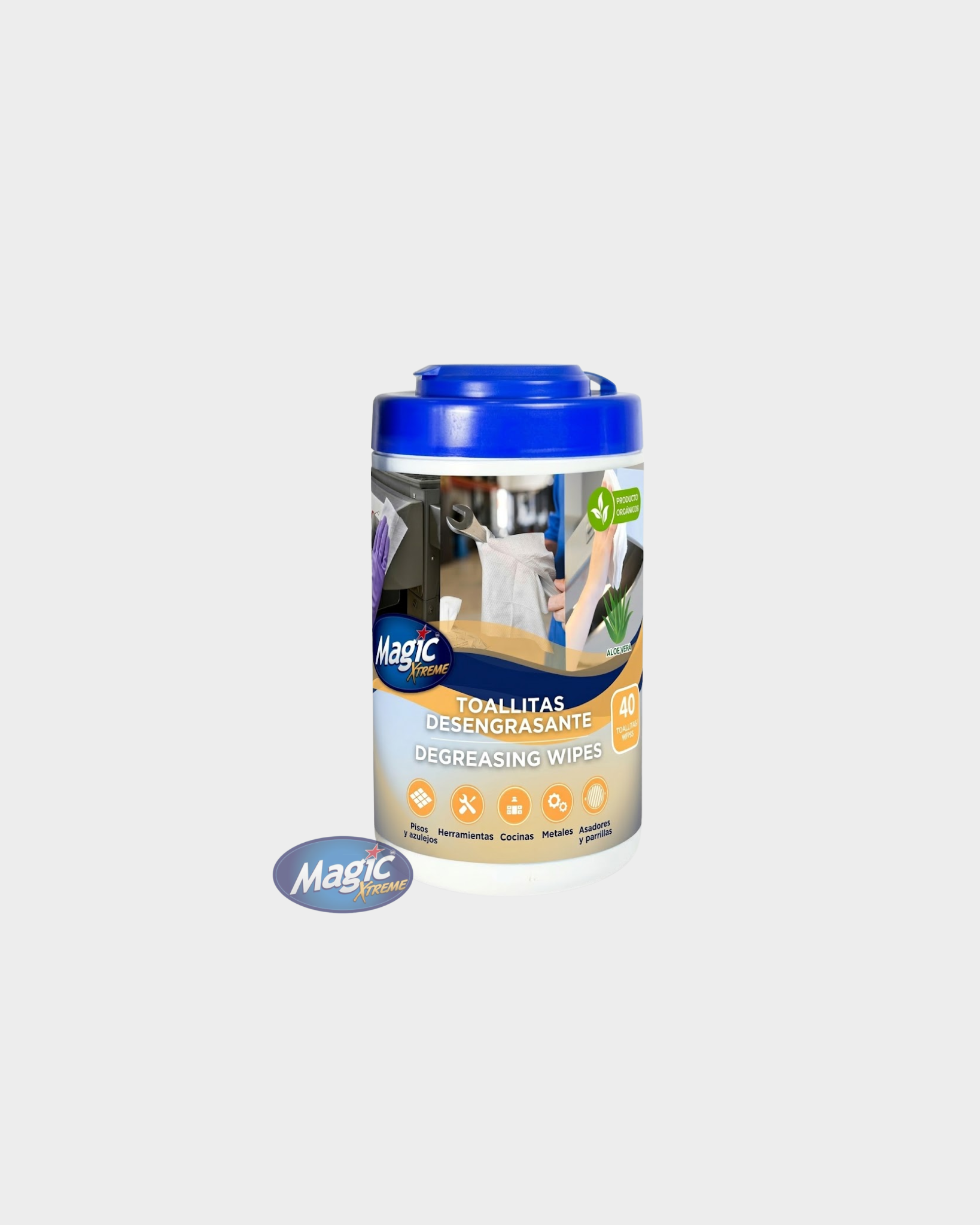 Toallitas desengrasantes listas para usar, formuladas con ingredientes ORGÁNICOS a base de agua.